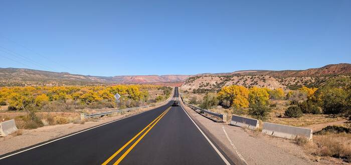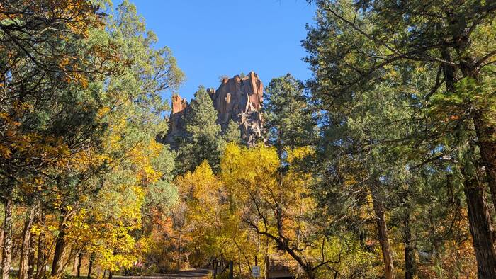 Monday was a gorgeous day with brilliant blue skies, so we headed toward Jemez National Forest, about an hour away. We made several stops to see the striking scenery, which included a special treat that we thought we could only get in Utah--red rocks!