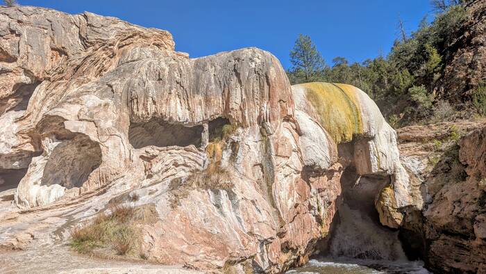 This unusual travertine rock formation by the side of the road is called "Soda Dam". Note the waterfall hiding inside.