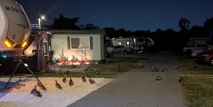 We made it safely to our RV park. Our assigned site this year wasn't as great as last year's, but it wasn't the worst one in the park (a plus!). Sorry, no pictures of the site. (Julie has really dropped the ball lately, but let's face it-- this RV park does not quite compare in natural beauty to the many scenic places we have been this year.) We do however have a picture of the darling "duck birds" (Black-Bellied Whistling Ducks) that call this RV park home most evenings and have the most cheerful chatter.