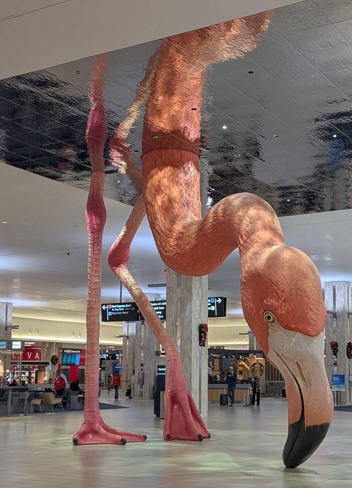 Julie is writing this post while sitting in the Tampa airport waiting to board a plane to escape sunny and 80 for snowy and 0. Being retired people, we have adopted the habit of getting to airports way too early because, well, what else do we have to do? The giant pink flamingo was a fun new touch this year...
