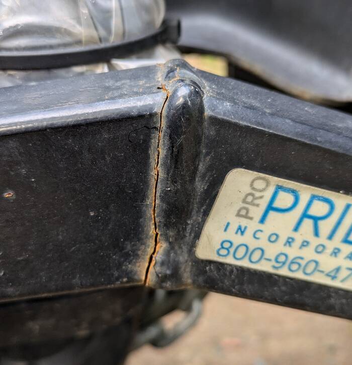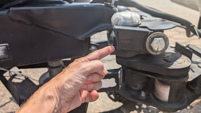 Some amount of time down the road, we pulled over at a gas station to get a visual on the hitch situation (trailer was swaying and new movement was felt during braking). Lo and behold, the crack was gone... the hitch component was now completely severed.