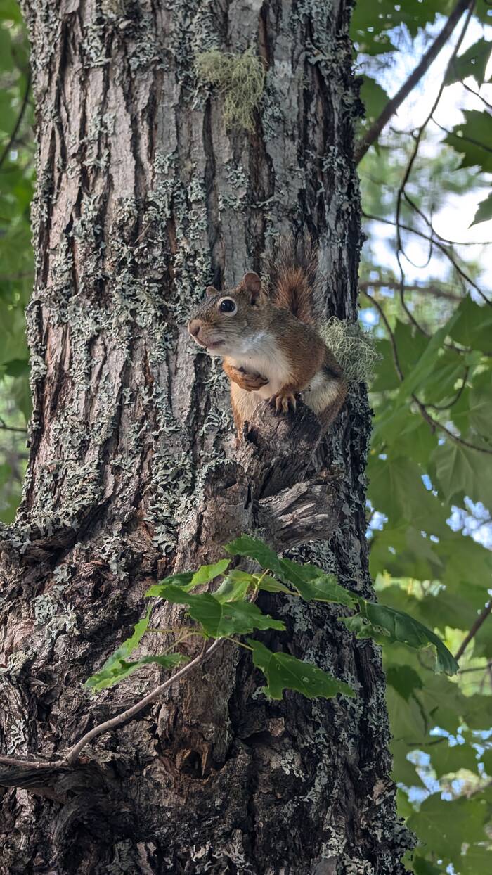 We though for sure Skippy was going to pounce on us from this tree by our deck. (He didn't)