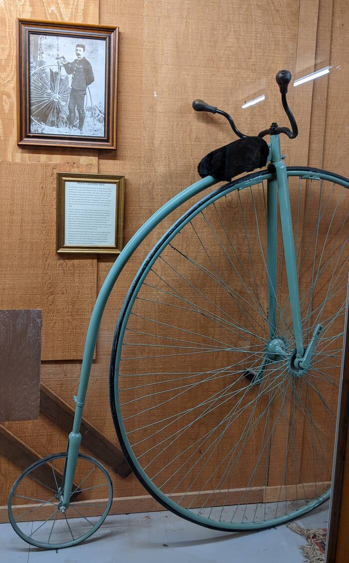 It's amazing that people actually rode these bikes (called penny farthings). Fun fact: There were no brakes, so slowing down was not always an option.