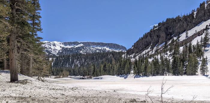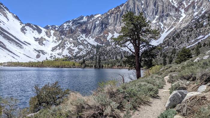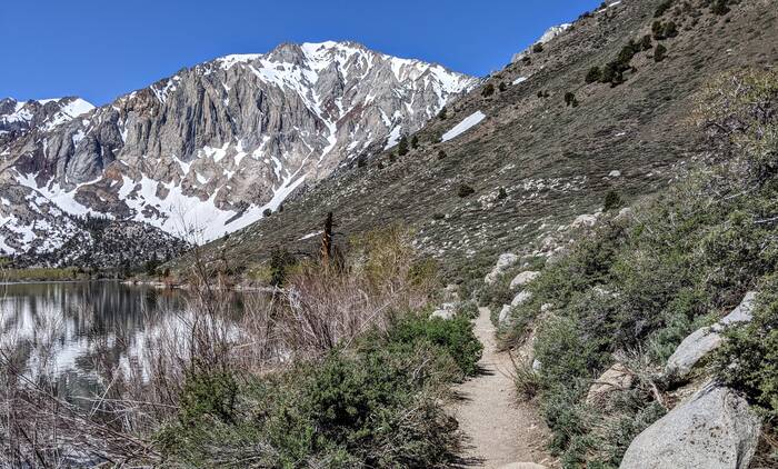 Thursday, we headed north along 395 and to higher elevations. Our first stop was Convict Lake. Most of the trail circling the lake was clear of snow, except for a spot a little more than halfway around the lake.