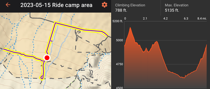 Behind our campsite was a dirt road calling out to be explored, so after setting up and having some lunch, we headed out on our bikes. The road gradually degenerated into little more than a wash, so we turned around and rode some of the local roads for a while. We ended up riding about 8.5 miles in total.