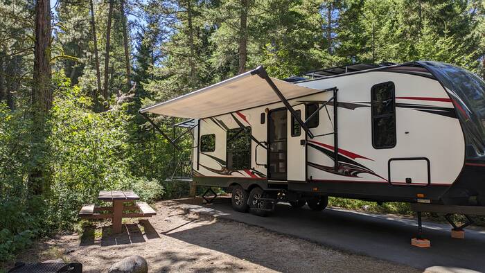 Our next campground was first-come/first-serve, and it always makes us a little nervous when we don't know if there will be an appropriate spot for us when we arrive. (That is why most of our campsites are reserved in advanced--we're just not super spontaneous people.) Fortunately, there were a few open spots, and we snagged a nice private site just as someone was pulling out. The site provided us with soothing babbling brook sounds (from a creek we couldn't see from the camper), and we were well buffered from the several generators down the road.