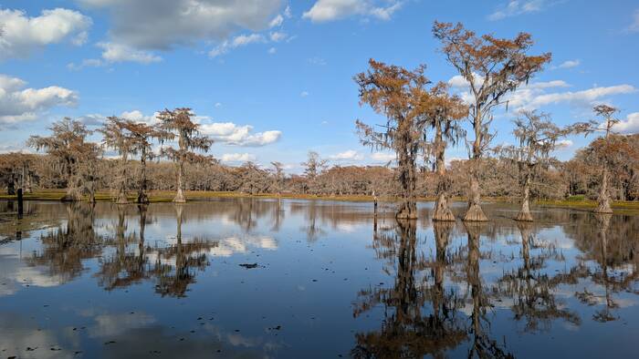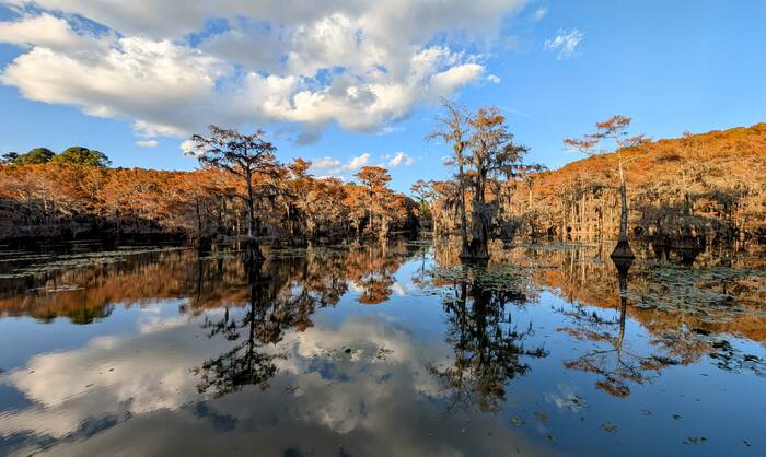 Caddo Lake Fun fact: Bald cypress trees are one of the few conifers that are deciduous. These specimens are sporting their "fall color".