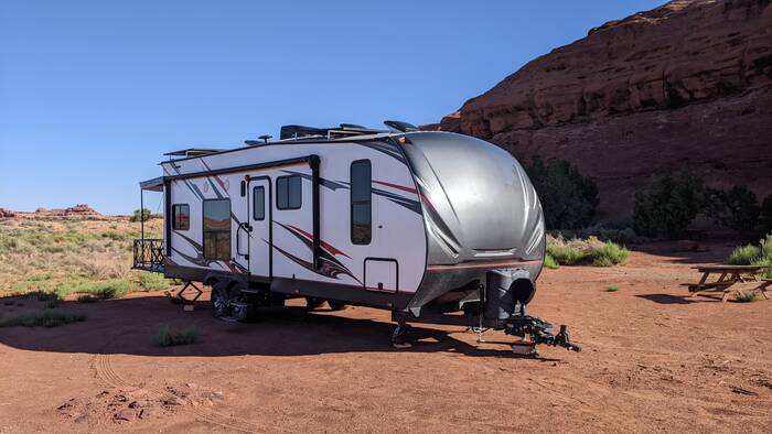 The great thing about a house having wheels is that you can simply move it someplace else whenever you want. Conveniently, we had already planned on going into Monticello the next day for church at noon (43 miles drive back through the mountains). So, we left early after breakfast and started scoping out free dispersed camping (boondocking) locations in the national forest on the way to Monticello. We found a few contenders and decided upon a secluded spot up a hill. When we returned to camp in the afternoon, we had a quick lunch, packed up, and headed out. As we stopped at the office to let them know we were leaving early, they told us this was the hottest week they had had since June. Just last week it had been in the upper 80s. Oh well, you can't control the weather, and at least we got to drive through the park and take in one of the most scenic hikes.