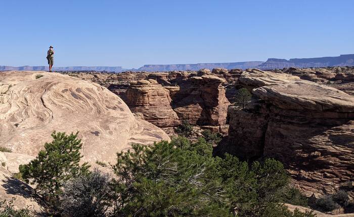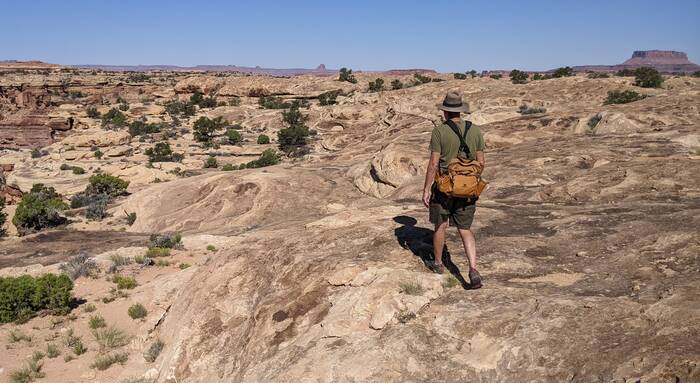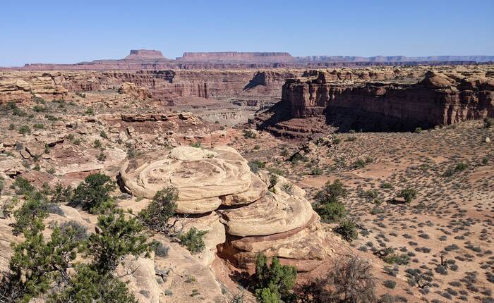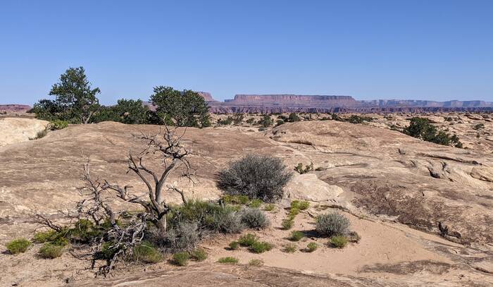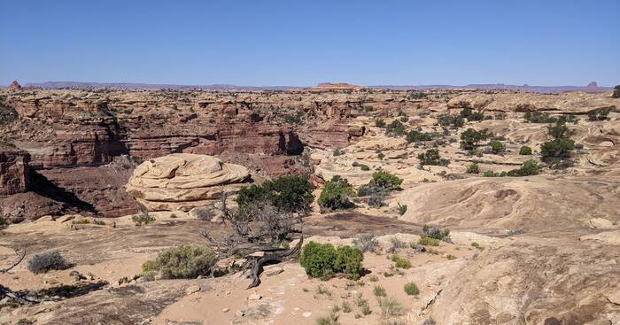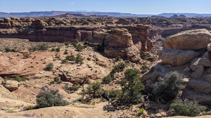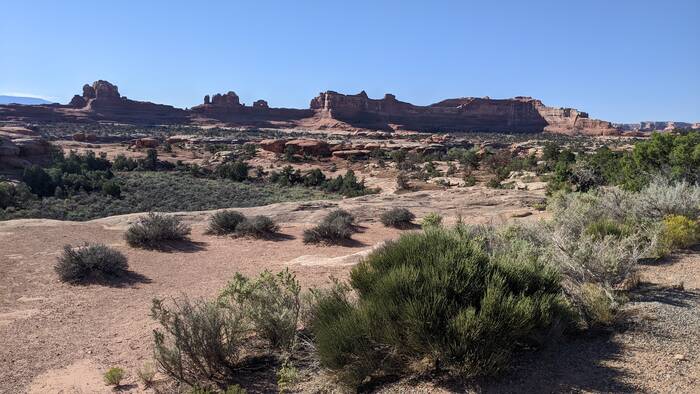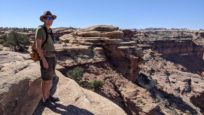 The next morning, we headed off to Canyonlands National Park where the attendant at the gate warned us to take a lot of water and be careful - forecast was for the 100s. Yikes! We chose the Slickrock hike which promised the most bang for the buck in terms of its scenery to effort ratio. It was mostly level-ish, not too long (3.2-mile lollypop), and it provided sweeping views in every direction. We really enjoyed this hike, and we finished it in time before it got too hot.
