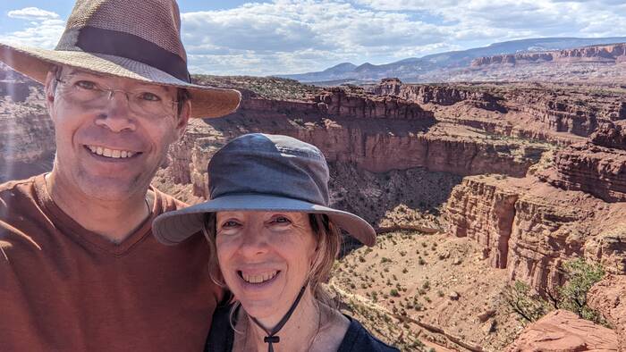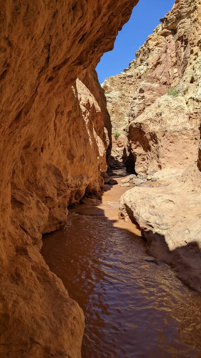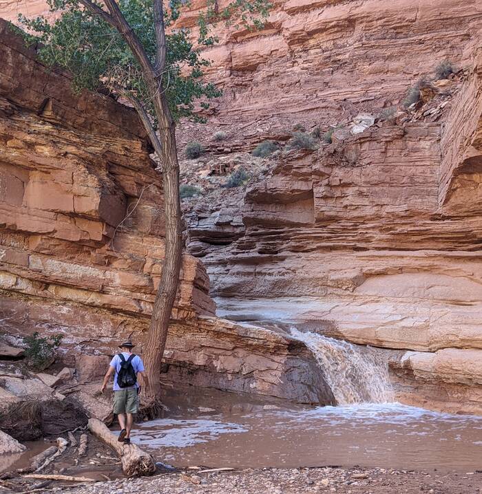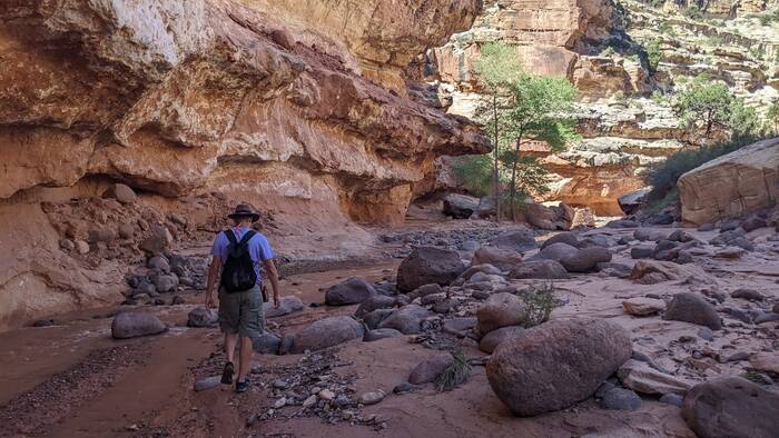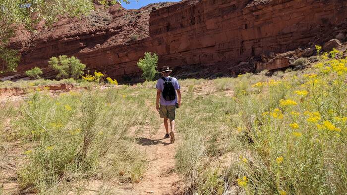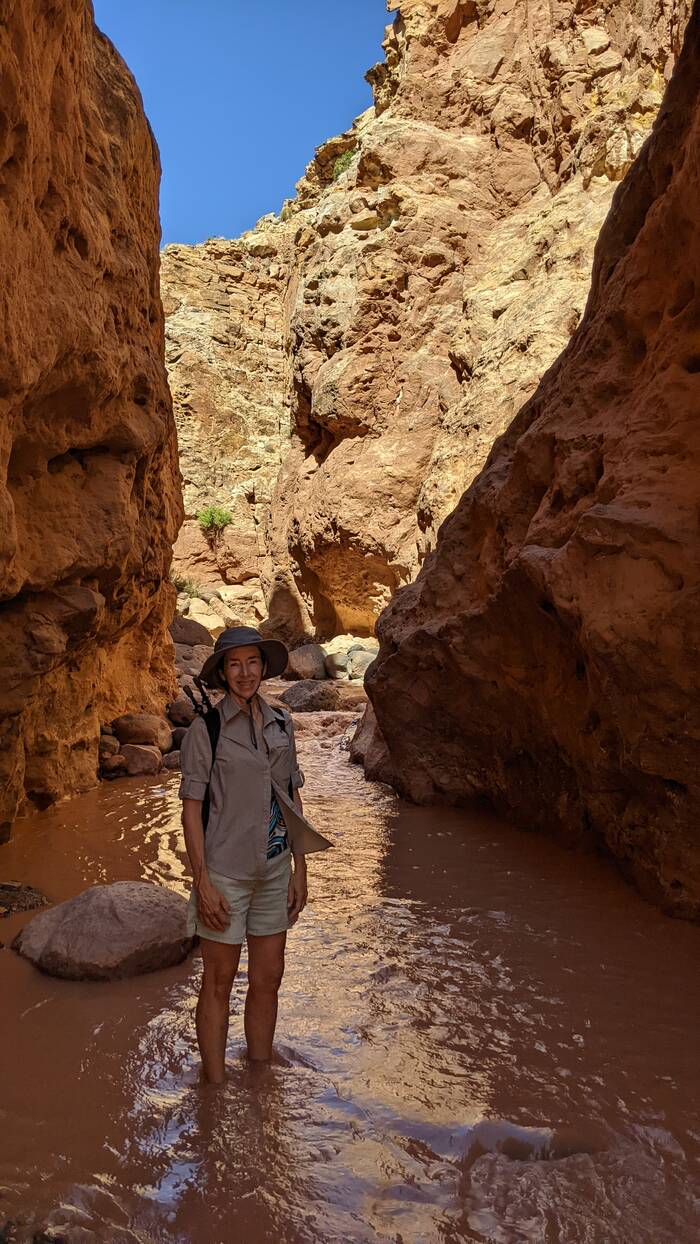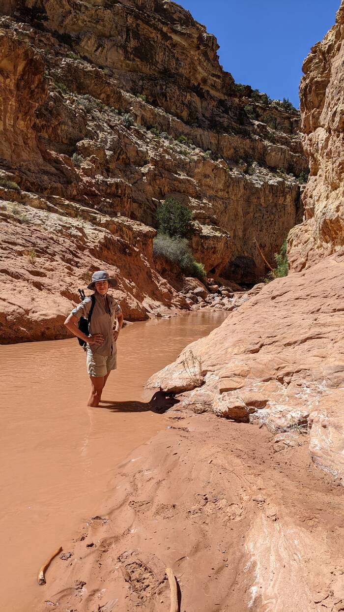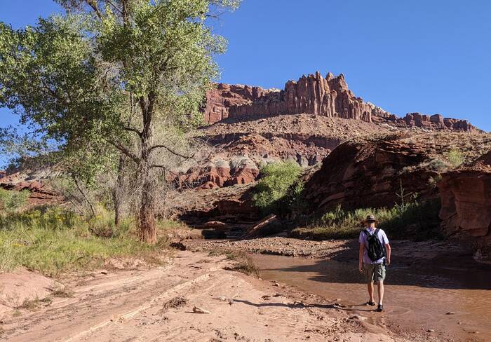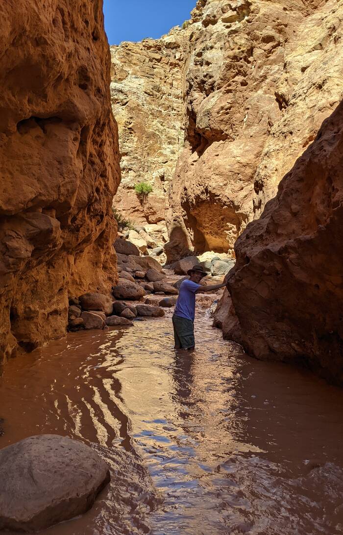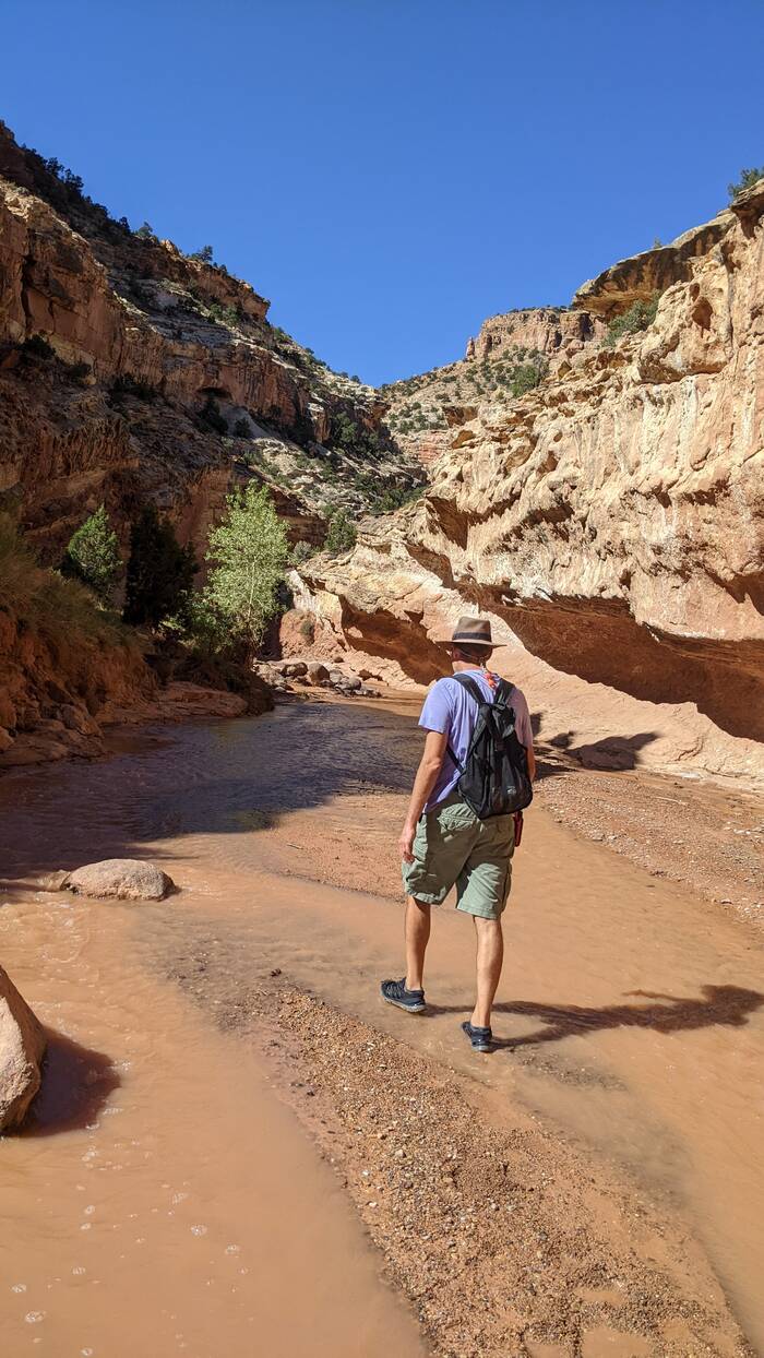 On our last day in Capitol Reef, we decided to do the "unofficial" Sulphur Creek trail. What else do you do when you want to hike, but the weather is expected to be in the mid to upper 90's? According to the national park service, it is generally recommended to hike the trail downstream (about 6 miles) and have a second car at the end to transport you back (or hitchhike or walk on the highway 3 miles uphill back to your starting point). This is not a maintained trail, and it includes wading/swimming in the narrows section (depending on water level) as well as getting yourselves past 3 waterfalls and several sketchy areas. We first thought of leaving our bikes at one of the trailheads, but decided against it because of the construction happening along the main road that involved numerous delays with lane closures and such. In the end, we decided to hike upstream (the "wrong" way) as far as we could, and then turn around and come back the way we came. This turned out to be a good choice as there was a waterfall bypass that involved some tall rock scrambling that Julie preferred not to do with her 56-year-old knees. So, that was where we decided to turn around. It was just as well, because by the end of our trek we were pretty tired, and going farther would have just made us more exhausted. Despite that, we really enjoyed this hike--it was a lot of fun!