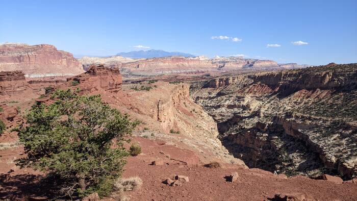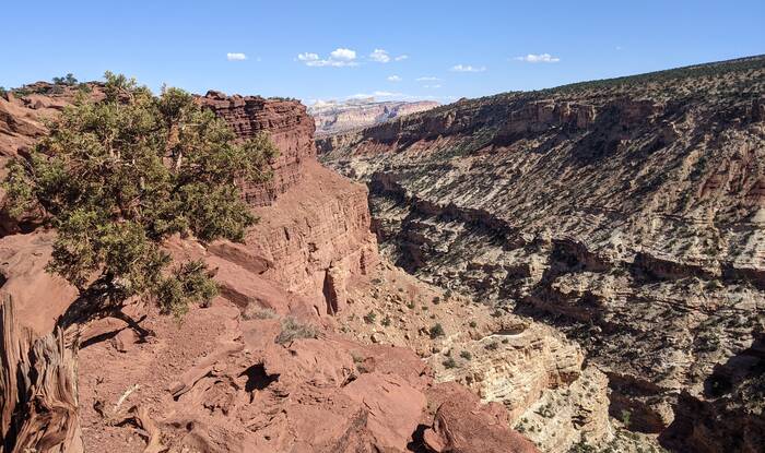 Later that afternoon, we took a short drive to the Gooseneck Scenic Overlook. Here was a dramatic view of a canyon created by Sulphur Creek over the (many, many) years. We had decided that we wanted to hike along/through Sulphur Creek the following day, and we figured we would do some reconnaissance to check it out from an eagle's perspective.