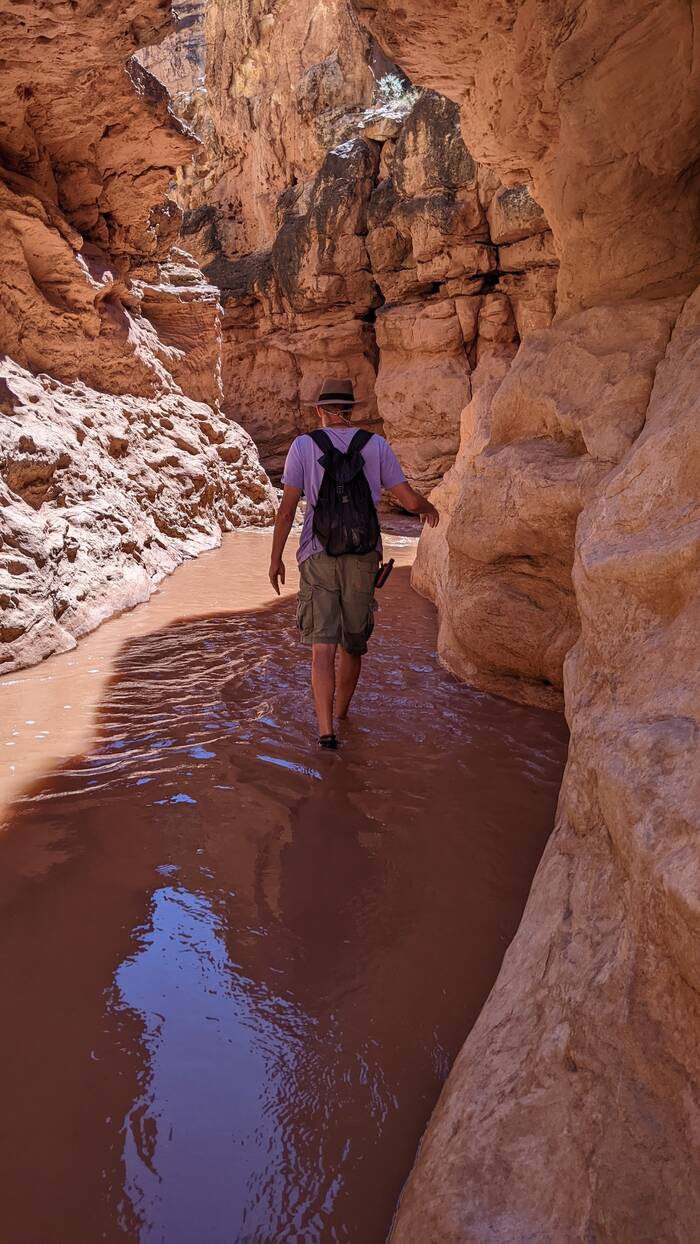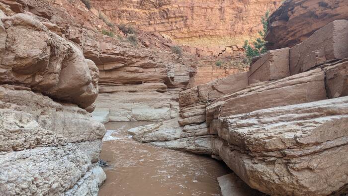 We continued upstream and had a lot of fun wading and scrambling along the route. Have to admit, though-- the silty, opaque water was slightly disconcerting, as there was no telling how deep your next step was going to be or what you would step in. Would it be friendly gravel or rock, or would it be slippery, suction-cuppy mud?