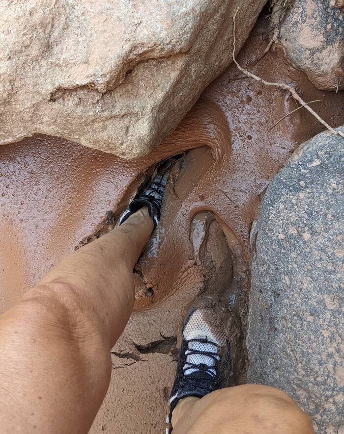 ...Immediately after that thought, Julie inadvertently stepped into said mud. She can't account for how silky it was, but it sure was squishy (and suction-y). Rick had to give her a hand to free herself--but not before snapping this shot 😉