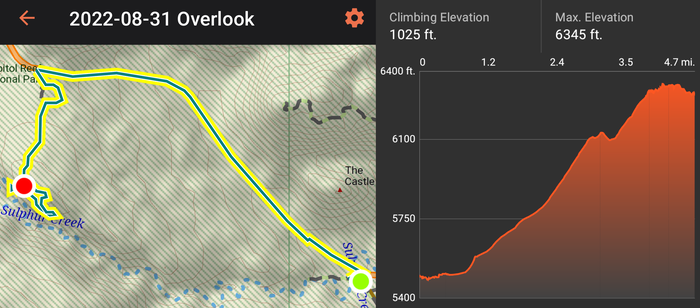 My bad - I forgot to reset the GPS before the hike so this also includes the driving from the campground to the overlook. The red dot was where we parked and just walked the small loop overlooking the canyon.