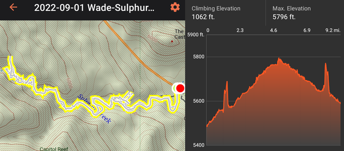 The GPS says we did 9.2 miles, but it was clearly confused by the canyons. This was probably closer to a 6 or 7 mile hike. The two spikes in the elevation are where we took the "bypass" around the lower falls to avoid the "narrow slippery ledge" or "slide down the falls into the hopefully deep enough pool" options. Why those two are not showing the same elevation I don't know as we took the same trail up and back.