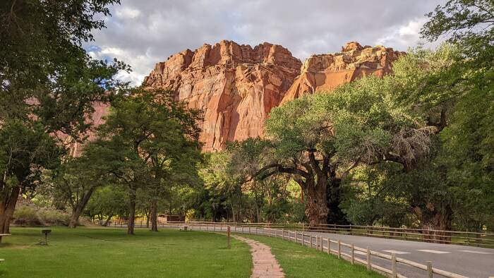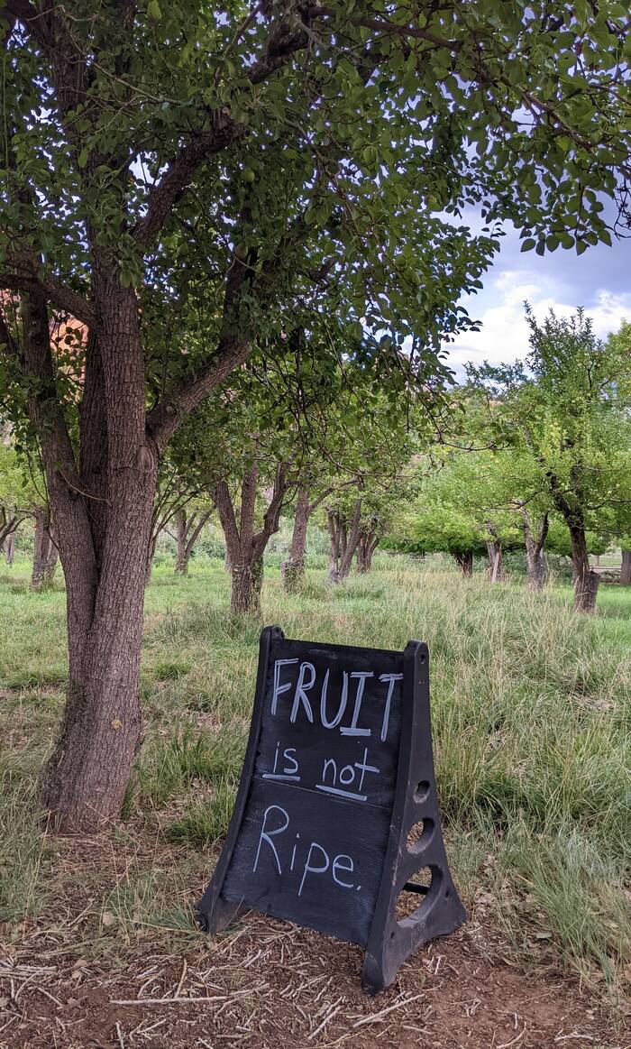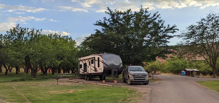 Fruita campground is located within the historic town of Fruita. It had previously been a Mormon settlement from the 1800's to as recently as the 1960's. Never having more than 10 families at any given time, the inhabitants had planted extensive orchards of apples, pears, peaches, apricots, cherries, and some nut trees. This part of Utah seemed an unlikely spot for such crops, but the river valley provided just enough water and shelter to make a go of it, albeit a difficult one for sure. The National Park Service continues to maintain the orchards, replacing dead trees as needed. When fruit is in season, you are free to enter the orchards and eat your fill (there is a small fee to take fruit out with you). Unfortunately, there was no ripe fruit when we were there.