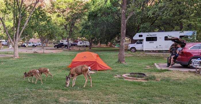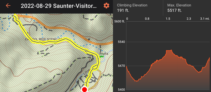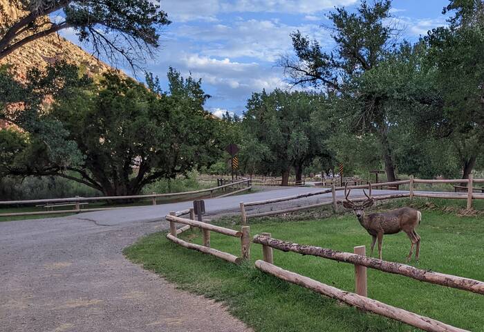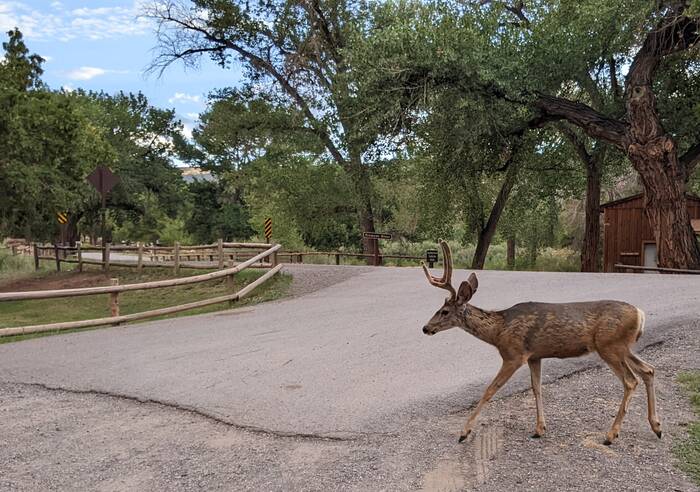 After we got setup and had dinner, we took a leisurely 1.5 mile stroll around the campground and surroundings. We walked along a pleasant path adjacent to the Fremont river that connected the campground with the visitor center and some of the historic buildings and orchards. We discovered a particularly high population of deer who did not have the slightest fear of people.