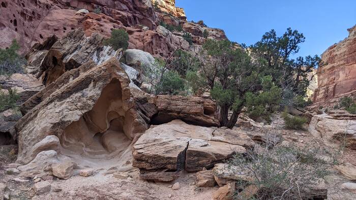 The next morning, we took the Cohab Canyon hike right off the campground. Legend says that this canyon got the name "Cohab" because the early Mormon settlers would send their extra cohabitating wives there to hide when government officials came to root out polygamists. Many do not put much credence in this legend, but the name stuck. The hike was 4.5 miles and climbed 984 feet total, and we were rewarded with a lot of varied terrain and scenery. We were glad we had started fairly early in the morning as it got pretty hot by lunch time we returned to camp. As an added bonus, we stopped at the historic Gifford House on the way back to buy two small fresh baked pies (one cherry, the other mixed berry). They were yummy!