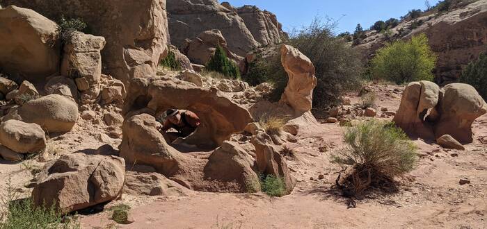 This rock grouping looks like a kiddie playground, complete with mini-arch! Rick's hiding a bit in the shadow of the arch.