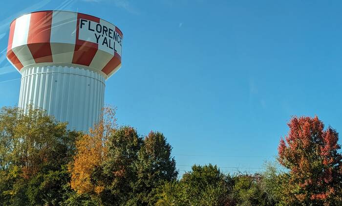 When we lived in this area, we often passed the Florence water tower, and it always made us chuckle a bit. The story goes that it used to say "Florence Mall", but there had been an ordinance against advertising on water towers, and a battle of sorts ensued. So, a compromise was reached...