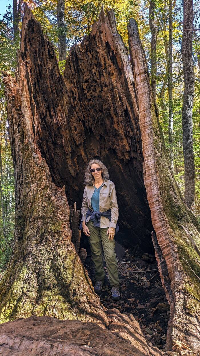 We hiked a trail (2 miles) in the Joyce Kilmer Memorial Forest in North Carolina. The forest contains many trees over 400-years-old, some more than 20 feet in circumference and 100 feet tall. The 3,800-acre forest was set aside in 1936 as a memorial to Joyce Kilmer (the author of the poem “Trees”) who was killed in action in France during World War I.