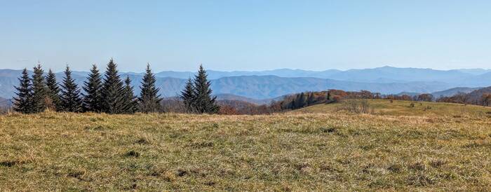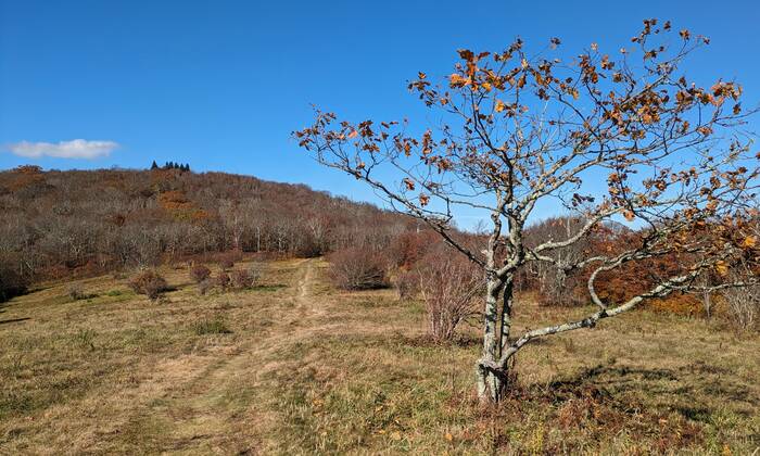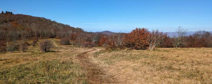 Back near the top of the mountain range, we took the Huckleberry Knob Trail (2 miles total) to one of the several "balds" in the Appalachian Mountains. There is considerable disagreement about the origin of these mountain-top grassy meadows. Some say the Native Americans created them, some say the early settlers cleared the land, and others say they are naturally occurring on some way.