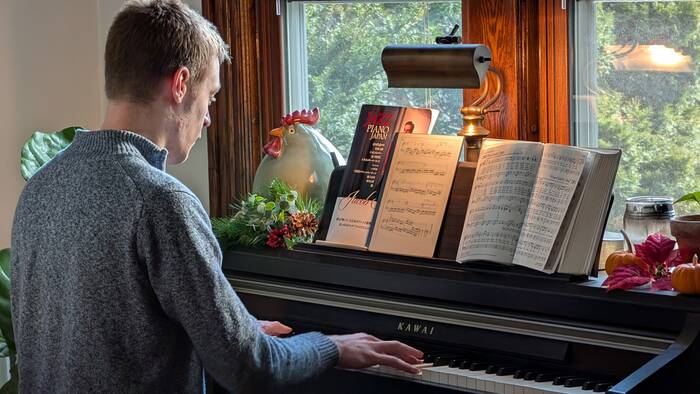 Alan practicing under the watchful eye of his coach, the Bulbous Chicken ...the true secret to his successful piano-playing prowess