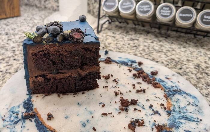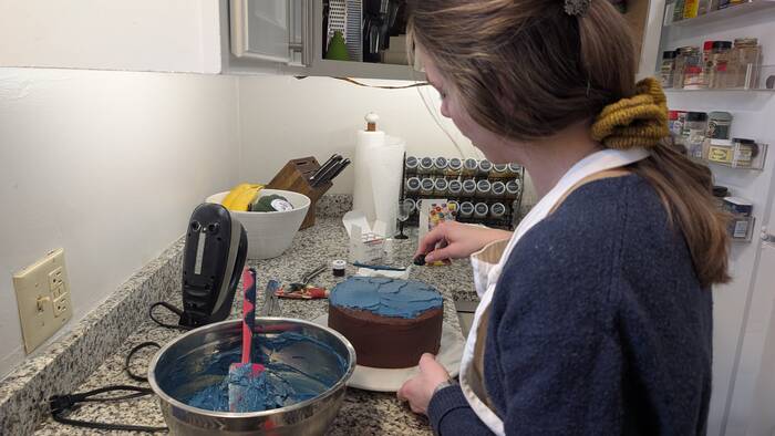 Audrey and Julie baked and decorated a cake together for one of Audrey's co-worker's birthday. Midnight teal-blue is apparently the co-worker's favorite color, so that's what the cake had to be.
