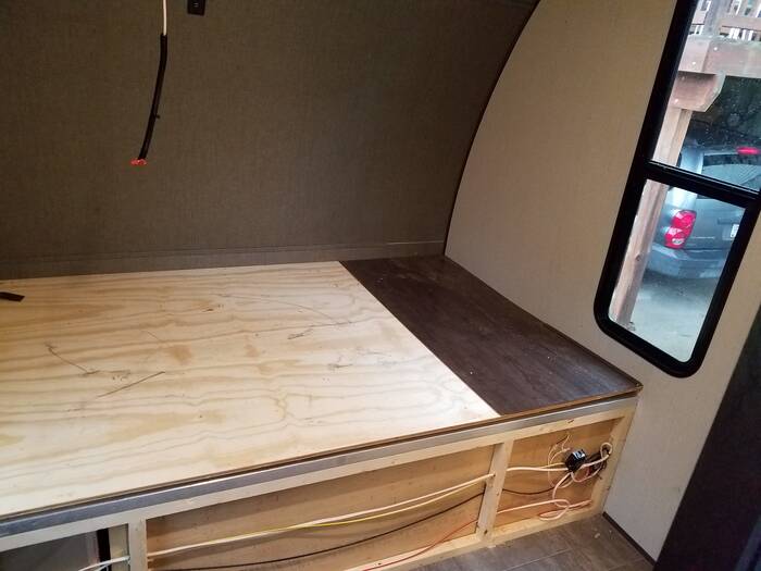 Then we kept going - taking off all the bed decking and cut the metal frame down to queen size width . . . This means that we are removing the pass through on the right side (the door is still there but will be insulated and sealed off. The pass through on the left side (the metal box on the left side) was designed for a built in generator - but we will just be using it for storage. As you can see we have removed most of the "outdoor" storage which the pass-through storage usually provides. Our plan is to use the bed of the truck for that kind of storage. The right side is getting turned into a large closet area so we will have plenty of clothing storage.