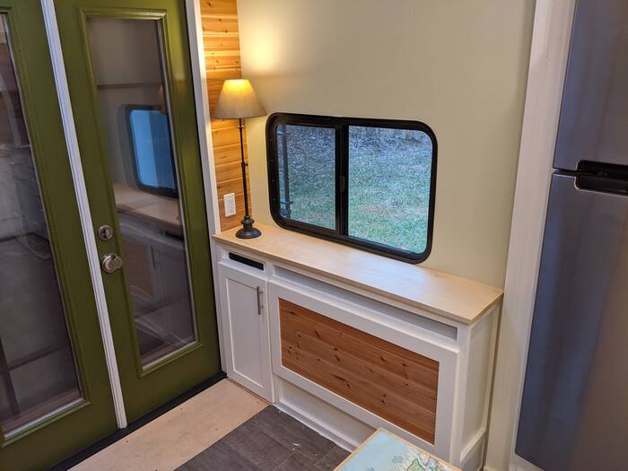 The stove area is now mostly complete with the exception of painting the sliding doors where coffee stuff and oils will probably be stored.