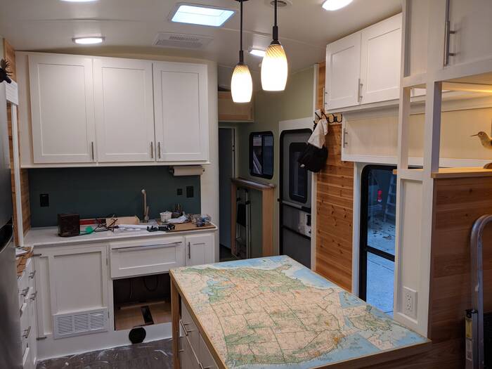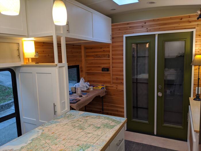 Looking toward the other side, the top cabinets and pantry are all finished and painted - along with another lamp which is also converted to 12V and bolted down on top of the pantry.