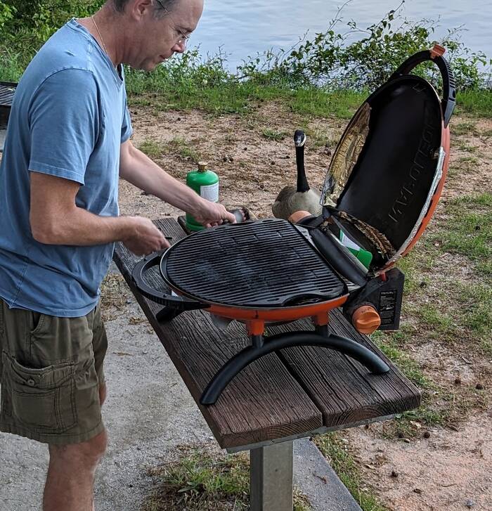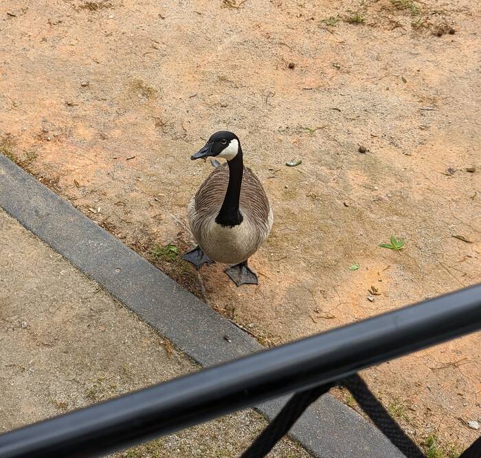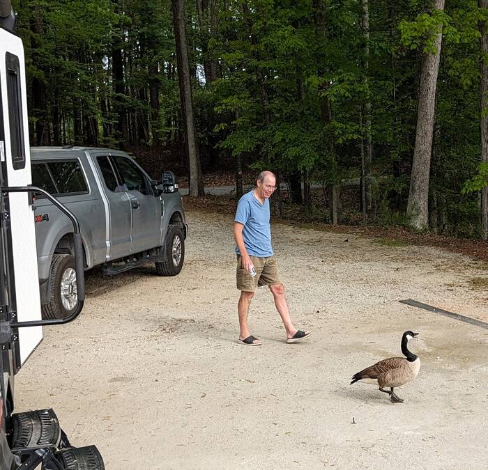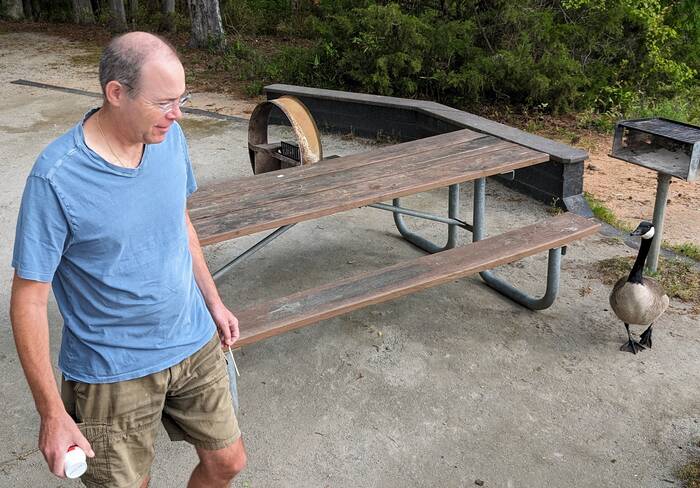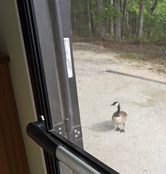 Unbeknownst to us, our campsite seemed to have been the personal property of one lone goose whom we named Gustav. Rick was getting tools out of the truck the first morning, and Gustav very deliberately walked toward him, expecting some kind of handout. Rick ignored Gustav, but Gustav was quite persistent and proceeded to follow him around. It wasn't until Rick got on a ladder to access the window screens for the permethrin application that Gustav freaked out and flew away in a panic. Regaining composure, Gustav later returned and ended up stalking us several times a day during our stay.