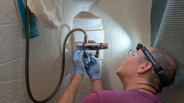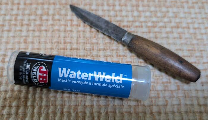 Unfortunately, after Rick had re-assembled the faucet, we discovered that the leak was actually caused by a crack in the pipe, and not a leaky gasket after all. Well, how do we fix that, you might ask? With epoxy of course! And, wouldn't you know, Rick has a collection of every epoxy ever created (that might be a bit of an exaggeration, but not by too much).
