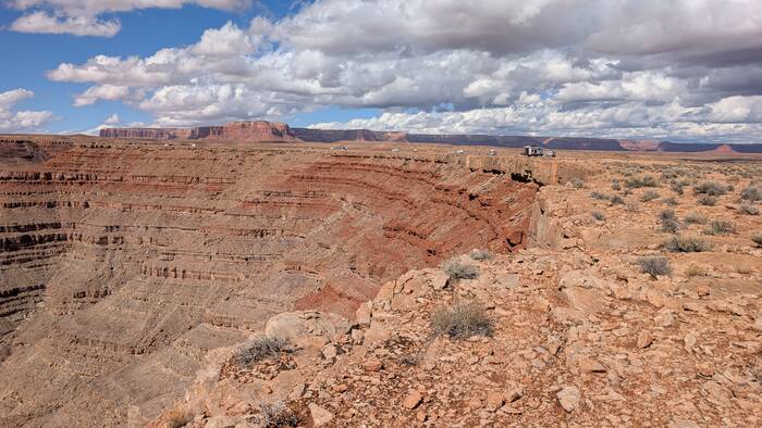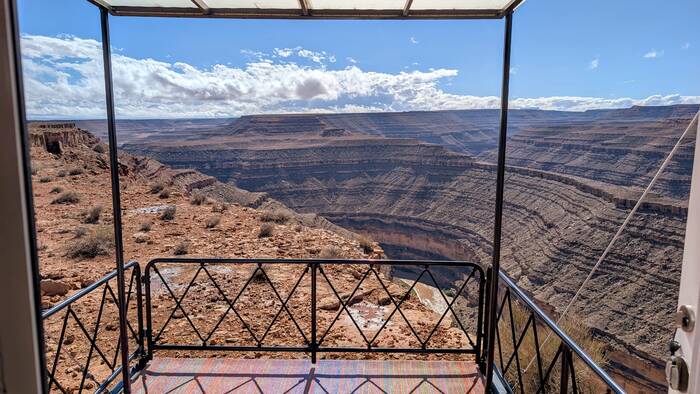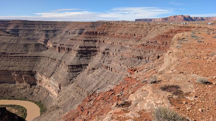 Goosenecks State Park occupies part of the "goosenecks" of the meandering San Juan river that had cut a deep canyon over time. Camping here is unique in that you pay your $10/night and then just drive along the canyon edge and find a spot to park. Rick wanted to back up right to the edge so that our deck would overhang the canyon, but Julie wasn't having any of that. We ended up compromising--we parked far enough away that we could walk comfortably around the deck and not be in immediate danger of plunging to our deaths into the San Juan, yet we were close enough to see to the bottom of the canyon from our deck. A win-win!