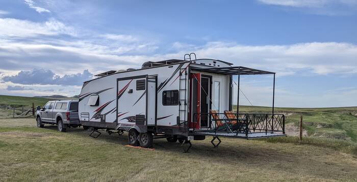 Campground Notes: We had a very pleasant and private dry camping site overlooking the National Grasslands. The drive in on the long gravel road stirred up a lot of dust that managed to find its way into the camper. Upon leaving after the rains, our camper was caked in mud in spots. The views and quiet more than made up for that bit of inconvenience.