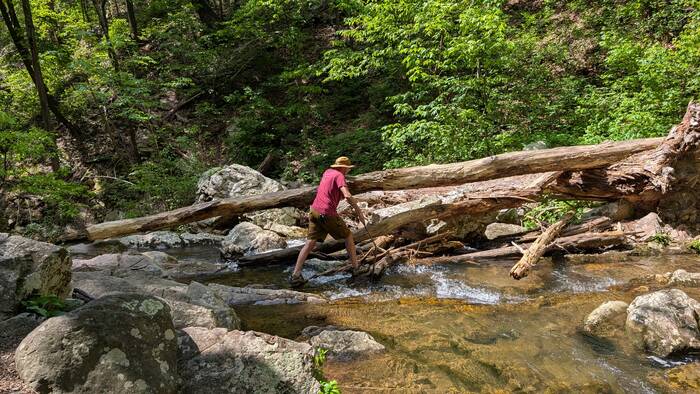 The trail continued for a short distance on the opposite side of the creek. Rick tried to scout out a "Julie friendly" way to cross without getting wet feet, but didn't find one that Julie approved of.