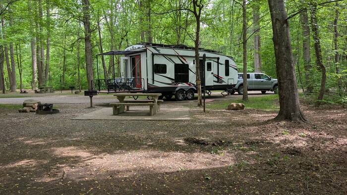 We encountered quite a bit of rain and gentle thunderstorms during the week which made for some cozy candle-lit reading time in the camper. "Candle-lit" because there were no electric hookups at this campground (and no generators allowed--yay!), and our site was quite shady (even on the few sunny days), so we had to watch our electric usage pretty closely. Of course, we still ran the dishwasher and did some streaming. One can't be too deprived of modern conveniences 😉.