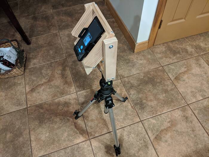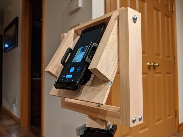 The bottom most piece of wood (little square block) has a 1/4-20 nut rammed into it so the tripod can screw into it. The horizontal piece above that is screwed into the lower block - with the screw directly under where the cell phone camera is (so if you swivel things so the phone is horizontal then the screw should be in the center of the image) . . . That horizontal piece has two verticals screwed to it (like goal posts) and this whole thing rotates around spinning like a top. The cell phone is mounted by re-using an old cell phone mount for a bike that I am no longer using. That is just screwed to 1/4" plywood which has some other wood mounted to it to hold everything in place and make it easy to locate the cell phone in the right spot . . . That whole cell phone mount is pivoted around the screws at the top of the goal posts so the whole cell phone mount thing can swing to look up and down (once again it has to swivel around the location of the camera lens on the phone).