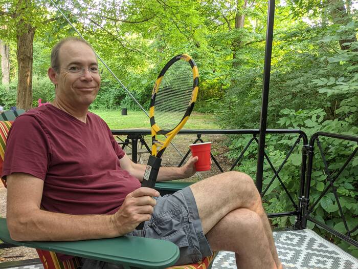 Give him a bug racket and a beer, and he's happy! :)
