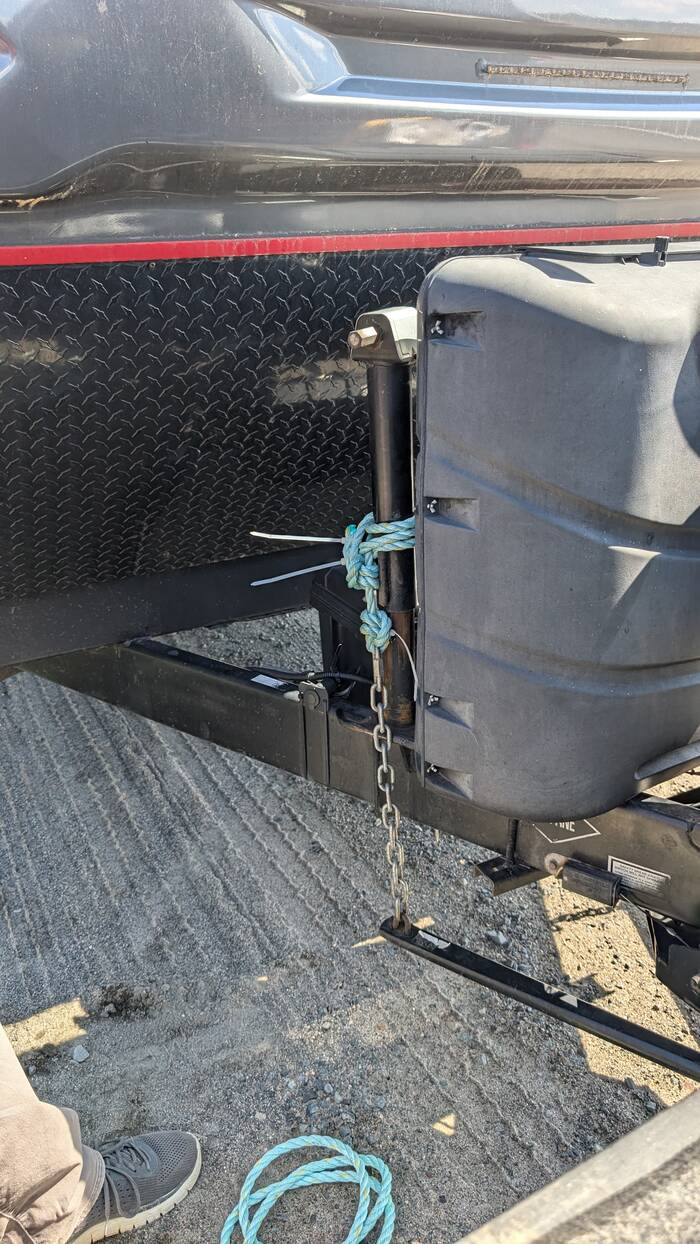 The next day, Rick implemented a fix to the hitch weight distribution bar support that did not involve rope or tie wraps. We won't know how well it will hold until we drive with it, but it looks more "legit" than the previous solution.
