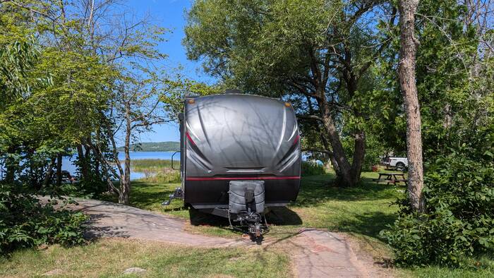 We stayed at a family-owned campground right in town and right on the shores of Georgian Bay. Our campsite took a little finagling to get into, due to the unique rocky terrain and mischievously placed trees on our site, but the view was amazing! One of our neighbors came over with a can of beer to watch us back in and to offer moral support. Even the owner came by to watch, as she doubted we would be able to get into the site.