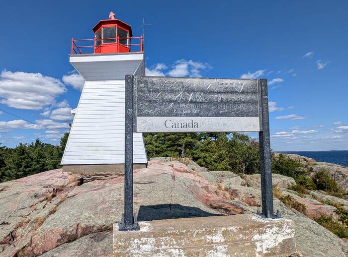 The sign has suffered the wrath of time and weather, but it reads in both English and French, "Killarney Lightstation" (along with a bunch of graffiti)