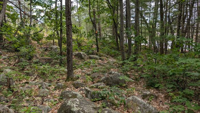 This trail continued to dish up a little bit of everything. When we got to the end of the lake, we had to traverse some quite swampy / buggy sections to get back to the Georgian Bay coast. From this point on, the trail whereabouts became anybody's guess. Every so often, a hopeful suggestion of the trail was offered by a smattering of trail tags and orange flags on trees, if you were lucky enough to notice them. Several sections would have been quite hard (almost impossible) to follow without the use of the GPS map.