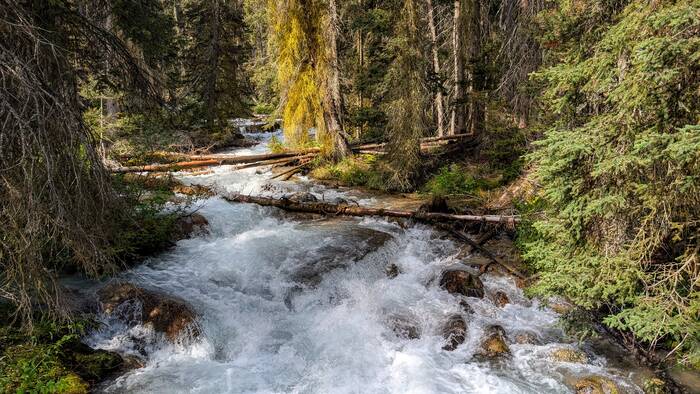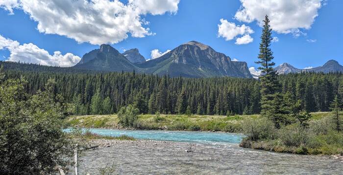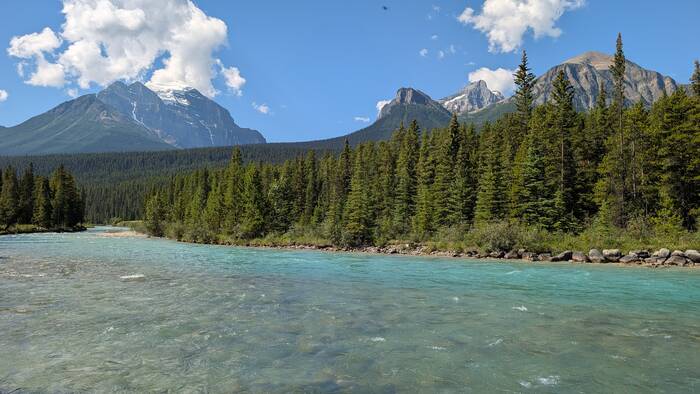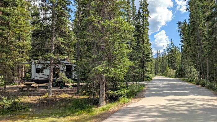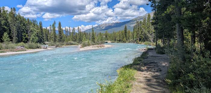 Rick started coming down with whatever we got (most likely flu or COVID) on Sunday night while we were still in Banff (thankfully after the kids had left and after laundry, shopping, and putting everything away). It started out as a slight scratchy throat, and we didn't think much about it. After traveling about an hour to the Lake Louise campground and setting up at the new campsite, Rick was exhausted and took a long nap that afternoon. The next morning, he never got out of bed. He barely got out of bed on Wednesday, either. During this time, Julie was feeling mostly fine, but she had a very slight tickle in the throat from time to time. The weather these days was gorgeous, so Julie would go out and walk the nearby trail along the Bow River and take a chair to read by the water for a couple hours each day. The campground and surroundings were quite beautiful.