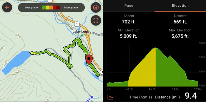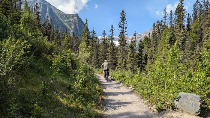 On Friday, Rick was doing better--better enough to lie be overly optimistic that he felt good enough to take a 9-mile round trip bike ride to the actual Lake Louise. It's so close, we just have to go, right? It was a pretty trail, although Julie wasn't fond of riding down the steep gravely switchbacks. Julie has had some bad experiences on loose gravely hills before, and has a little bit of PTSD in that regard. But, it was nice to get out and about.