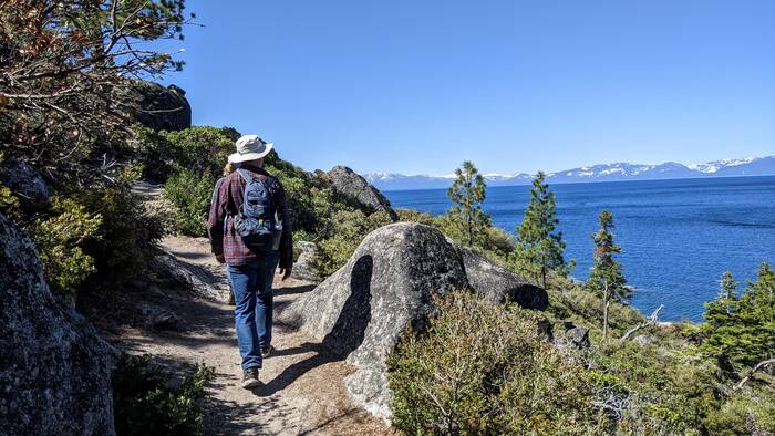 On Saturday, we did the grand tour of Lake Tahoe, with Maura acting as our tour guide. She had previously cycled the 75-mile road that encircles the lake, so she knew all the best spots. Our first stop was Sand Harbor State Park in Nevada. We got there mid-morning when it was still a bit chilly, but there were plenty of people in bathing suits swimming in the frigid water.