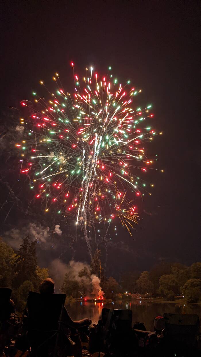 There seemed to have been some kind of miscommunication between the pyrotechnician and the festival organizers, as the piped-in patriotic music ended well before the firework display was finished. No matter, they were just as enjoyable "au naturel". However, the ending was a little awkward, as there was more a sputtering slow-down rather than an exciting grand finale. After there was no firework set off for about 10 seconds, a few people started quietly cheering. Then another firework went off. After another 10 seconds, the announcer came on to thank everyone for attending. As people started to leave, a couple more leftover fireworks were shot off. Kind of weird.