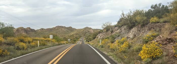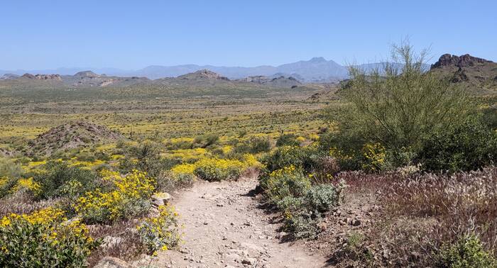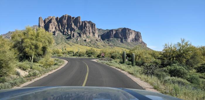Entering Lost Dutchman State Park with a view of the Superstition Mountains
