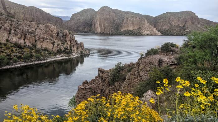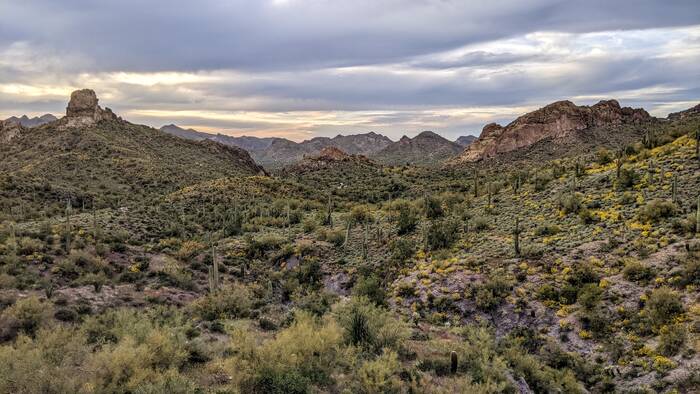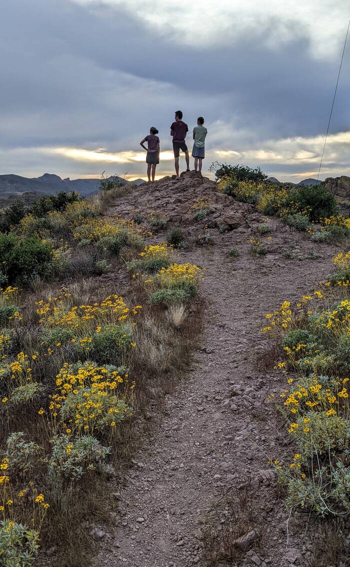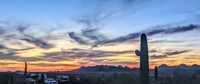 The following day, we picked up the kids from the Phoenix airport. After a brief stop at the camper, we headed out for a drive on the Apache Trail to Canyon Lake for a picnic dinner. We had high hopes of catching an epic sunset, but unfortunately it turned out to be mostly cloudy, so there was no epic to be had. The scenery was still nice, though.