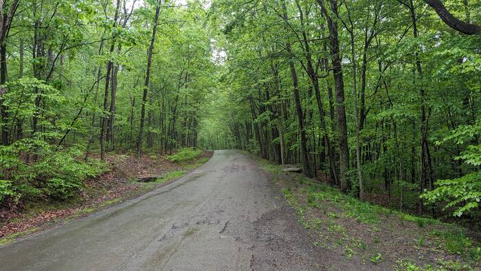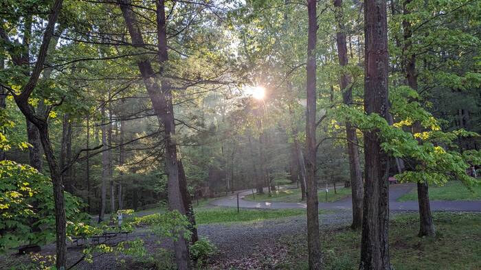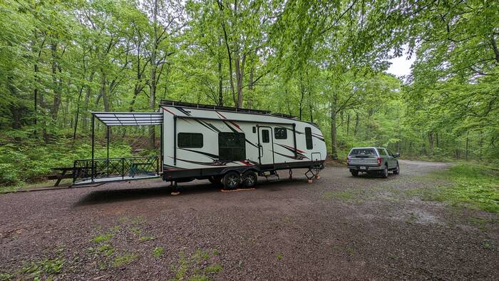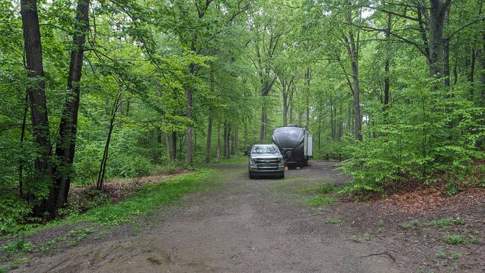 We had one more stop in Pennsylvania on our trek northward. After clear skies for most of the journey, we arrived to gloomy drizzle at our very spacious new campsite in the trees.